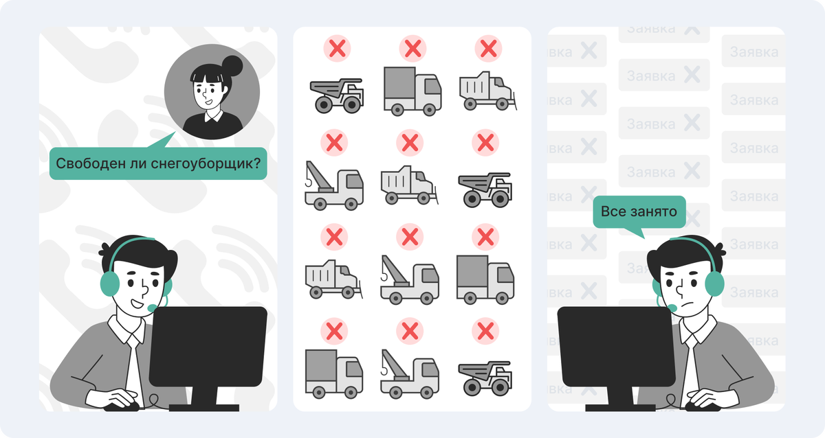 Долгий поиск. Управление спецтехникой без единой цифровой программы не дает четкого представления о занятости и местонахождении. Диспетчеры вынуждены обзванивать начальников цехов и водителей, чтобы найти свободный трактор или снегоуборщик по заявке. Обычно это занимает от 1 до 3 часов.