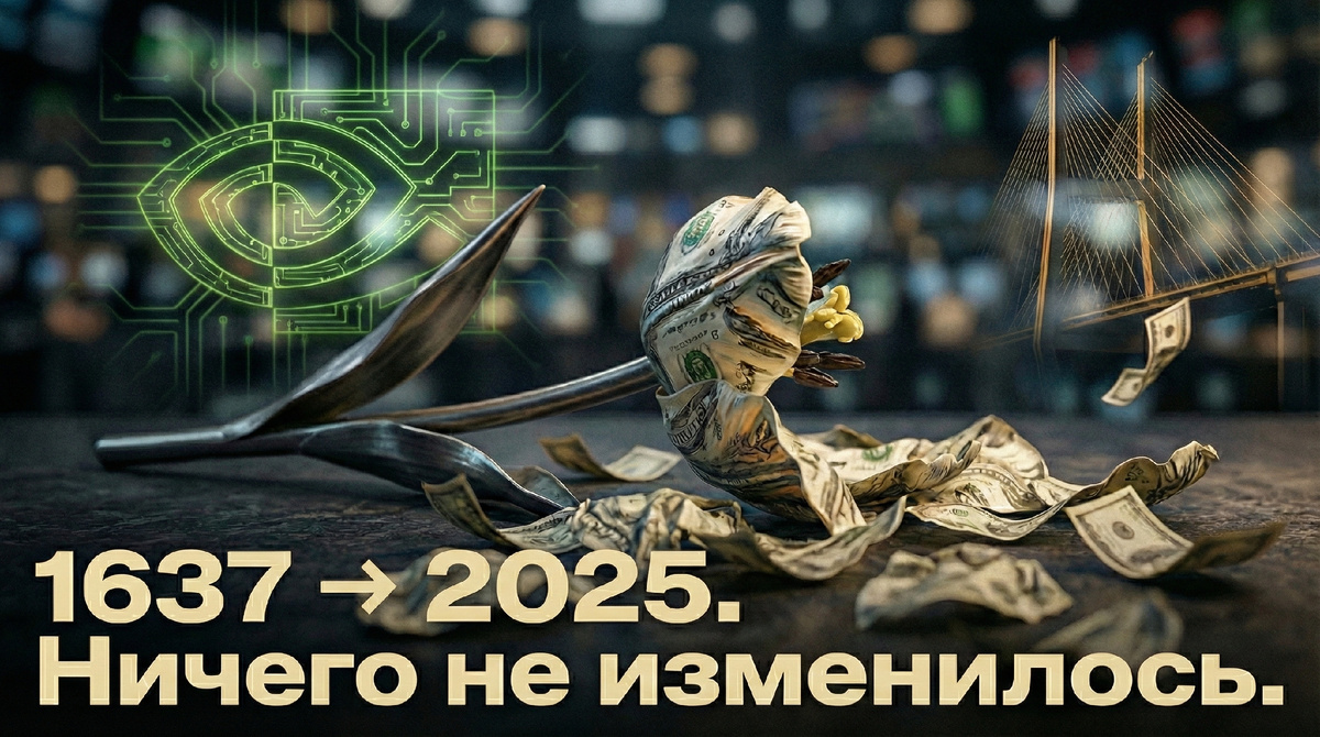 1637 год, Голландия. Страна сходит с ума по тюльпанам. Одна луковица стоит как дом в Амстердаме. Люди продают землю, берут в долг, лишь бы купить. «Тюльпаны — это новое золото!» — кричат на каждом углу. А потом за одну неделю цены рухнули в 100 раз. Те, кто покупал на пике, потеряли всё. Почему вспомнил? Листаю ленту, каждый второй «гуру» кричит: «Покупайте ИИ! Nvidia будет стоить триллион!». И у меня дежавю. Я не против технологий. ИИ реально изменит мир. Но давайте посчитаем на пальцах. Пример из истории. 2000 год. Все кричат: «Интернет изменит мир!». И были правы, действительно изменил. Была тогда компания Cisco. Она делала оборудование для интернета, как сейчас Nvidia делает чипы для ИИ. Все хотели её акции. Что произошло: В марте 2000-го акция стоила $80. С тех пор бизнес вырос в 4 раза. Но акциям понадобилось 25 лет, чтобы вернуться к тому же уровню. Только в конце 2025-го цена снова дошла до $80. Как так? Бизнес вырос, а инвесторы в нуле? Просто в 2000-м цена была безумной. Люд