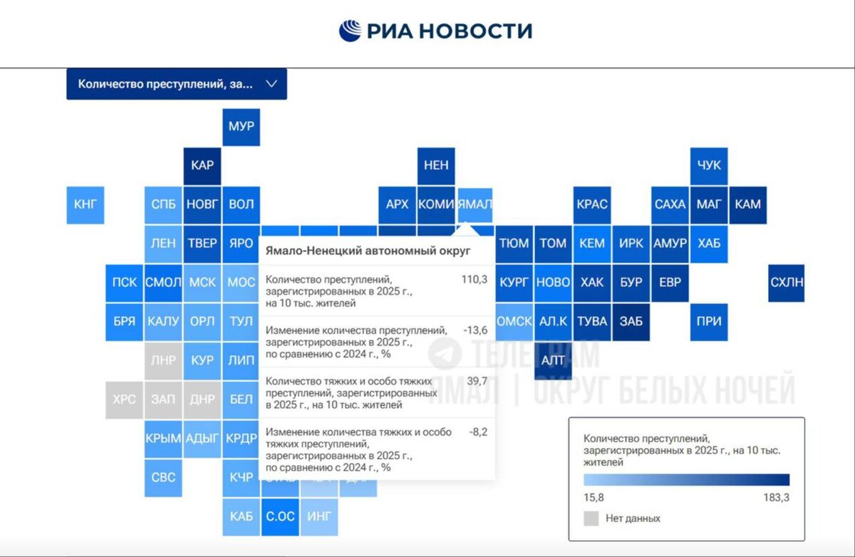 Согласно исследованию «РИА Рейтинг», в ЯНАО на каждые 10 тысяч человек приходится 110,3 зарегистрированных преступлений. По сравнению с 2024 годом их число сократилось на 14,8%, что позволило региону улучшить позицию — годом ранее он занимал 39-е место. Количество особо тяжких также сократилось на 9,3%. Наименьший уровень преступности отмечен в Чечне, Ингушетии и Дагестане, наибольший — в Карелии, Забайкальском крае и на Алтае. Новые регионы в исследование не включались. Верим? Подписаться | Прислать новость | Мы в MAX