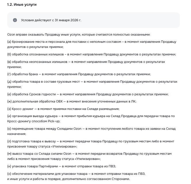 С 31 января 2026 года Ozon считает услугу доставки возвратов оказанной в одном из двух случаев: ✔ либо когда товар передан продавцу, ✔ либо когда товару присвоен статус «Утилизирован». Формально — просто уточнение момента оказания услуги. По сути — очень удобная для площадки конструкция. Почему это важно. 1️⃣ Услуга считается оказанной, даже если товар вы не получили Если товар утилизирован — услуга доставки возврата считается выполненной. Физически товара нет, проверить его состояние невозможно, но деньги за услугу уже «заработаны». 2️⃣ Утилизация = финальная точка без возможности спора Статус «Утилизирован» становится юридически равным передаче товара продавцу. Это закрывает пространство для дальнейших претензий: ✔ что именно утилизировали, ✔ в каком состоянии, ✔ можно ли было вернуть. 3️⃣ Риски полностью переложены на селлера Решение об утилизации принимает площадка. Момент оказания услуги — тоже. А платить за это должен продавец, даже если он с этим решением не согласен.