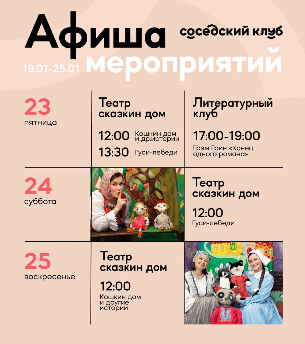 ⭐️ Мы начинаем с понедельника! Теперь каждый понедельник будем выкладывать афишу мероприятий на неделю, для вашего удобства 🫶🏼 Подробности/Запись: +7 (911) 956-49-53 Антонина +7 (987) 071-98-79 Сергей личные сообщения https://vk.com/club222629903