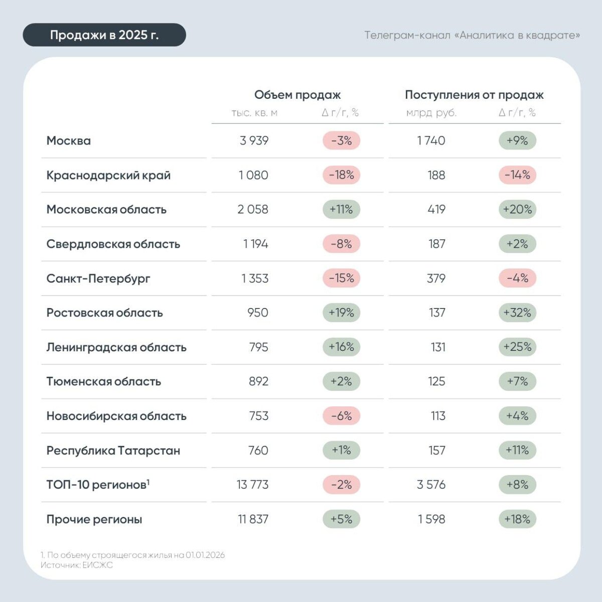 Итоги продаж новостроек в крупнейших регионах РФ за 2025 год
