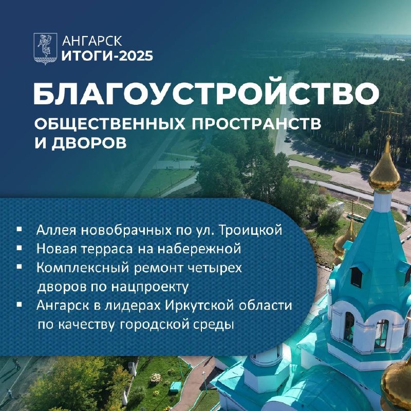 🔹Ангарский округ продолжает участвовать в национальных проектах Итоги первого года реализации новых национальных проектов обсудили на совещании под руководством Губернатора Иркутской области Игоря Кобзева. Регион в 2025 году участвовал в 14 президентских нацпроектах из 19. Ангарский округ не стал исключением. Так, национальный проект «Инфраструктура для жизни» позволил продолжить благоустройство дворов и общественных пространств. ✔️В прошлом году преобразилась территория около Ангарского Свято-Троицкого собора. Аллея новобрачных протянулась от строящегося ЗАГСа до памятника благоверным Петру и Февронии Муромским. ✔️Участие в этом национальном проекте помогает также ремонтировать придомовые территории – приводить в нормативное состояние проезды во дворах, расширять парковки, обновлять спортплощадки, устанавливать игровые комплексы для детей. Такие работы по благоустройству в 2025 году выполнили на четырех ангарских придомовых территориях, три из которых расположены в микрорайоне Кит