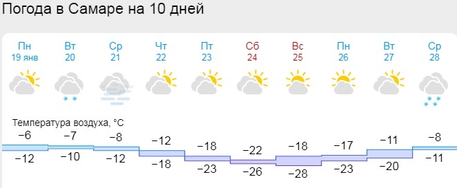 На Самарскую область надвигается арктическая стужа. Температура за окном ближайшие пару дней еще продержится на уровне 10-12 градусов ниже нуля. А затем начнется её неумолимое падение. В четверг мороз ударит до -18 ˚С, в пятницу – до -23, в субботу – до -26. Апогея похолодание достигнет в воскресенье, 25 января. Столбики термометров, по прогнозу специалистов Gismeteo, местами опустятся до –28 градусов. Впрочем, выходные при этом обещают быть безветренными и солнечными, что располагает к популярным зимним досугам. Будни последней январской недели обещают быть более теплыми, хотя и потепление будет происходить постепенно. 19 января в Самаре 41 высотка, 2 детских сада и школа посреди января остались без отопления. Фото: Gismeteo