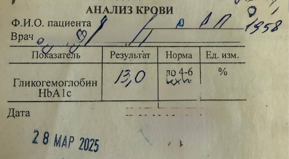 ! В кабинет приходит человек со своей историей, записанной —рукой врача в диагнозе, цифрами в стопке анализов, самим пациентом в дневнике давления и сахаров, в глазах, которые перестали верить, что может стать легче. Пациентка, 67 лет. Гипертония. Сахарный диабет. Атеросклероз. ИБС. ХСН. Перенесённые инфаркт и инсульт. Тяжёлый ковид в пандемию. Фото 1. Март 2025: Гликированный гемоглобин — 13% — крик организма. Давление прыгало, сахара зашкаливали, таблеток было больше, чем оставалось надежды на лечение. Улыбка даже редко не появлялась на ее лице. Она говорила: Доктор, я просто устала. Устала болеть. И вот всё удовольствие в моей жизни — съесть сладкого. Я от сладкого не откажусь. Мы начали с простого — с разговора. Не с допроса, а с диалога. Оказалось, что за «устала» скрывалось больше, чем общая слабость. Снижение настроения и потеря радости и удовольствия в жизни. Ежедневная головная боль и обезболивающие горстями. Депрессия, отчаяние, нежелание — или даже почти невозможность —