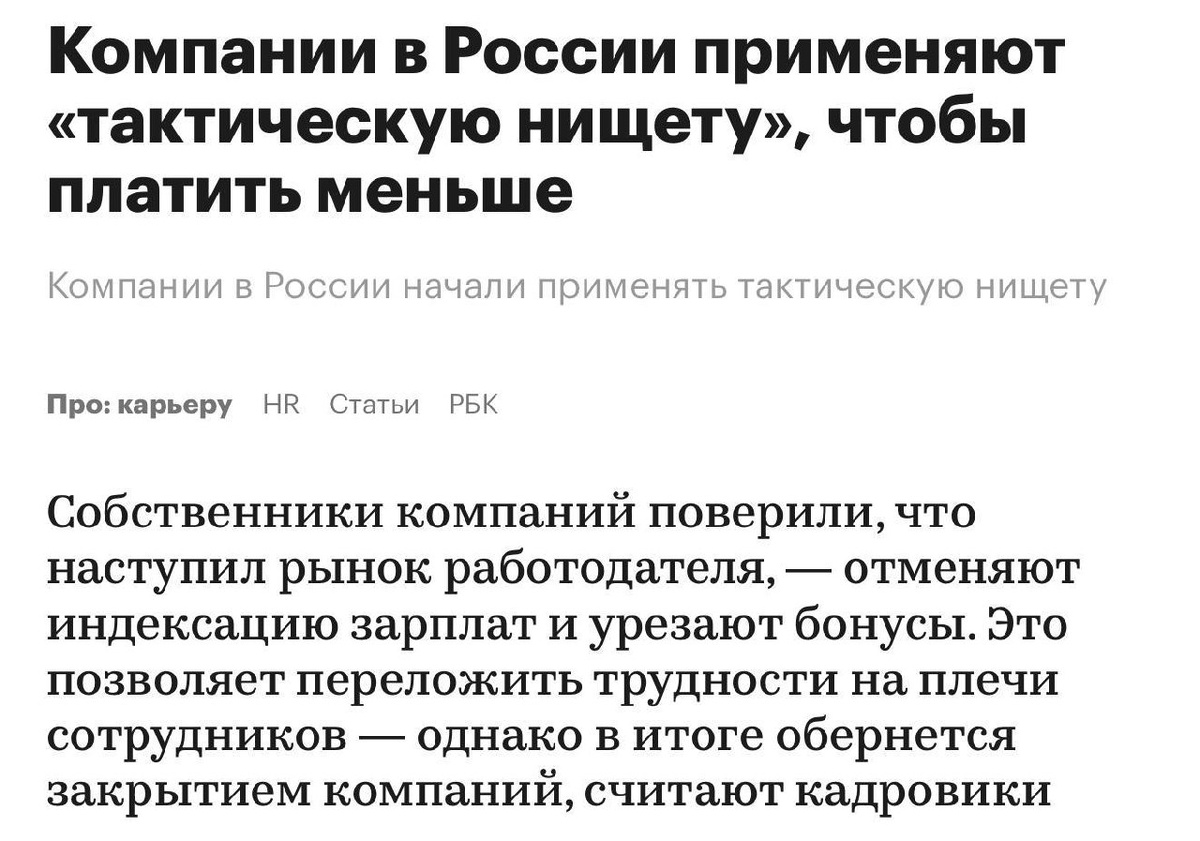 Привет, друзья! Сегодня мы поговорим о том, как некоторые компании обманывают сотрудников под видом кризиса. Вы наверняка слышали о том, что многие работодатели отменяют индексацию зарплат и урезают бонусы. Они оправдывают это сложными экономическими условиями, но так ли это на самом деле? Эксперты называют происходящее переходом на модель «тактической нищеты». Фирмы заявляют о кризисе, но на деле их доходы пока не сокращаются. Это позволяет переложить трудности на плечи сотрудников. Однако кадровики считают, что такая тактика может обернуться закрытием компаний. Почему? Потому что сотрудники, которые не получают достойную оплату труда, теряют мотивацию и перестают быть эффективными. В итоге компании теряют прибыль и закрываются. Это важный вопрос, который касается каждого из нас. Ведь от того, как мы работаем и какие условия нам предлагают, зависит наше будущее. Не пора ли работодателям пересмотреть свои подходы? Ведь в условиях конкуренции и борьбы за таланты, компании, которые не за