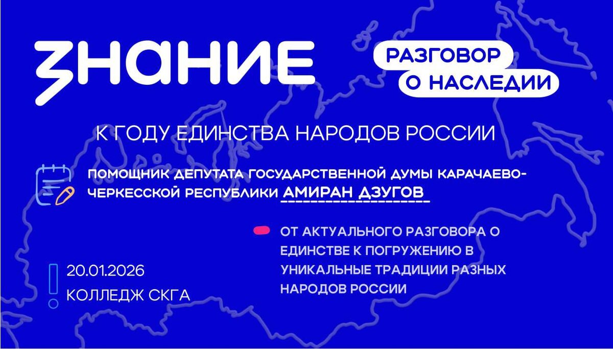 Уже завтра, 20 января, на базе колледжа Северо-Кавказской государственной академии состоится лекция, организованная Российским обществом «Знание». Мероприятие пройдет в рамках Года единства народов России, объявленного Президентом Российской Федерации Владимиром Путиным. В формате проекта «Знание.Лекторий» для порядка 250 студентов состоится интерактивная встреча, посвященная богатому этнокультурному многообразию нашей страны. Лекция станет не просто теоретическим выступлением, а живым диалогом о традициях, ценностях и устоях, которые на протяжении веков формировали единство народов России. 🔴Спикером мероприятия выступит помощник депутата Государственной Думы Карачаево-Черкесской Республики Амиран Дзугов. Он вовлечет студентов в обсуждение вопросов межнационального согласия, роли культурного наследия и сохранения национальной идентичности в условиях современного мира. Участников ждет интеллектуальное путешествие от актуальных тем единства и взаимодействия народов до открытой дискусс