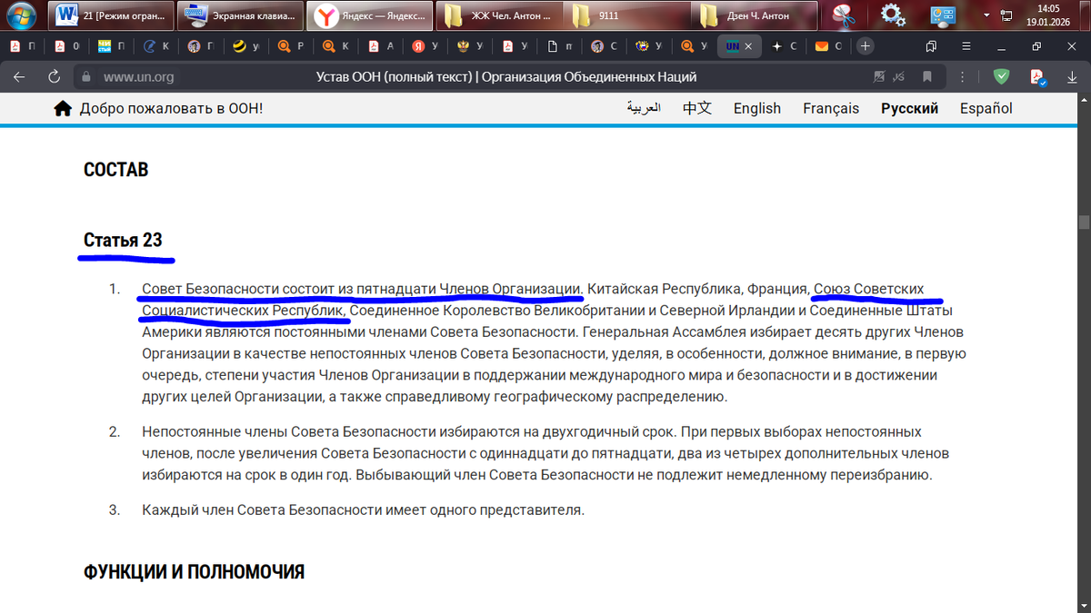 Получаю доступ на земле через World Wide Web (Всемирная Компьютерная Сеть) в информационно-телекоммуникационную сеть Internet («Интернет») и через соответствующую поисковую систему (браузер) на страницу сайта URL - адрес: https://www.un.org/ru/about-us/un-charter/full-text © ООН. На настоящей странице опубликован Устав ООН (полный текст), СОСТАВЛЕНО в городе Сан-Франциско, июня двадцать шестого дня, тысяча девятьсот сорок пятого года (26.06.1945 г.). Согласно ст. 23 настоящего устава: Совет Безопасности состоит из пятнадцати Членов Организации. Китайская Республика, Франция, Союз Советских Социалистических Республик, Соединенное Королевство Великобритании и Северной Ирландии и Соединенные Штаты Америки являются постоянными членами Совета Безопасности. Генеральная Ассамблея избирает десять других Членов Организации в качестве непостоянных членов Совета Безопасности, уделяя, в особенности, должное внимание, в первую очередь, степени участия Членов Организации в поддержании международног