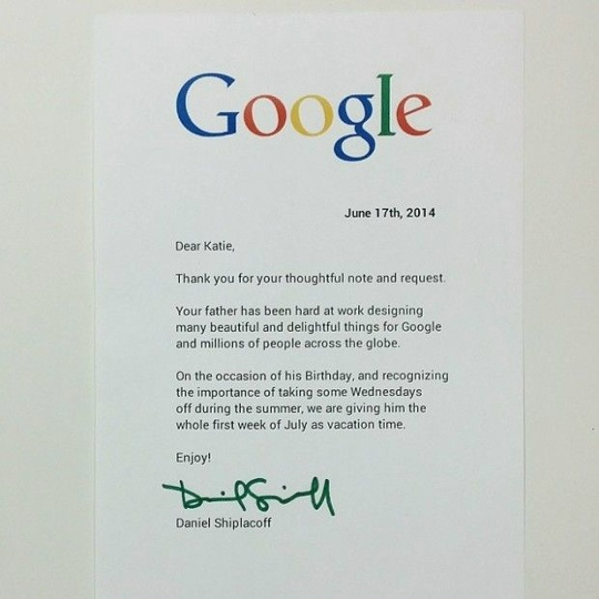 Кэти добавила в конце: «P.S . Это день рождения папы. P. P. S. И сейчас лето, понимаете». Как ни странно, в Google ответили Кэти. В письме говорится, что отец девочки получит не один день, а сразу неделю выходных: «Твой отец хорошо работал над созданием многих красивых и восхитительных вещей для Google и миллионов людей по всему миру. По случаю его дня рождения и понимая важность сред в течение лета, мы даём ему отпуск на всю первую неделю июля».