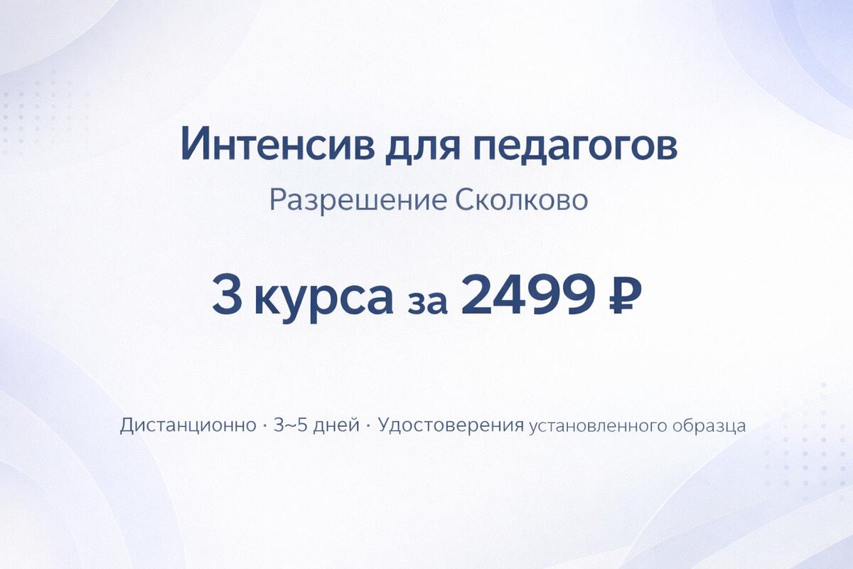 Разрешение Сколково» ✔ Что это такое? Это формат, в котором вы можете собрать бюджетный комплект из трёх курсов повышения квалификации — всего за 2499 ₽! ✔ Какие плюсы? — обучение дистанционно, в комфортном темпе; — 3 курса повышения квалификации на выбор; — объём каждого курса: 16, 18, 36, 72 или 108 часов; — 3–5 дней на обучение; — отдельное удостоверение по каждому курсу; — документы принимаются при аттестации и проверках. ☝️ВАЖНО Мы сотрудничаем с ДПО-организацией, имеющей разрешение на осуществление образовательной деятельности на территории инновационного центра «Сколково». Удостоверения соответствуют изменениям в законодательстве с 01.09.2025 (ФЗ-86) и принимаются образовательными организациями, контролирующими органами и аттестационными комиссиями. Спешите записаться! ❕Акция действует — до 28 февраля. 🔗 Обучаться с выгодой → Бюджетно, быстро, просто Мой университет 🎓🤓