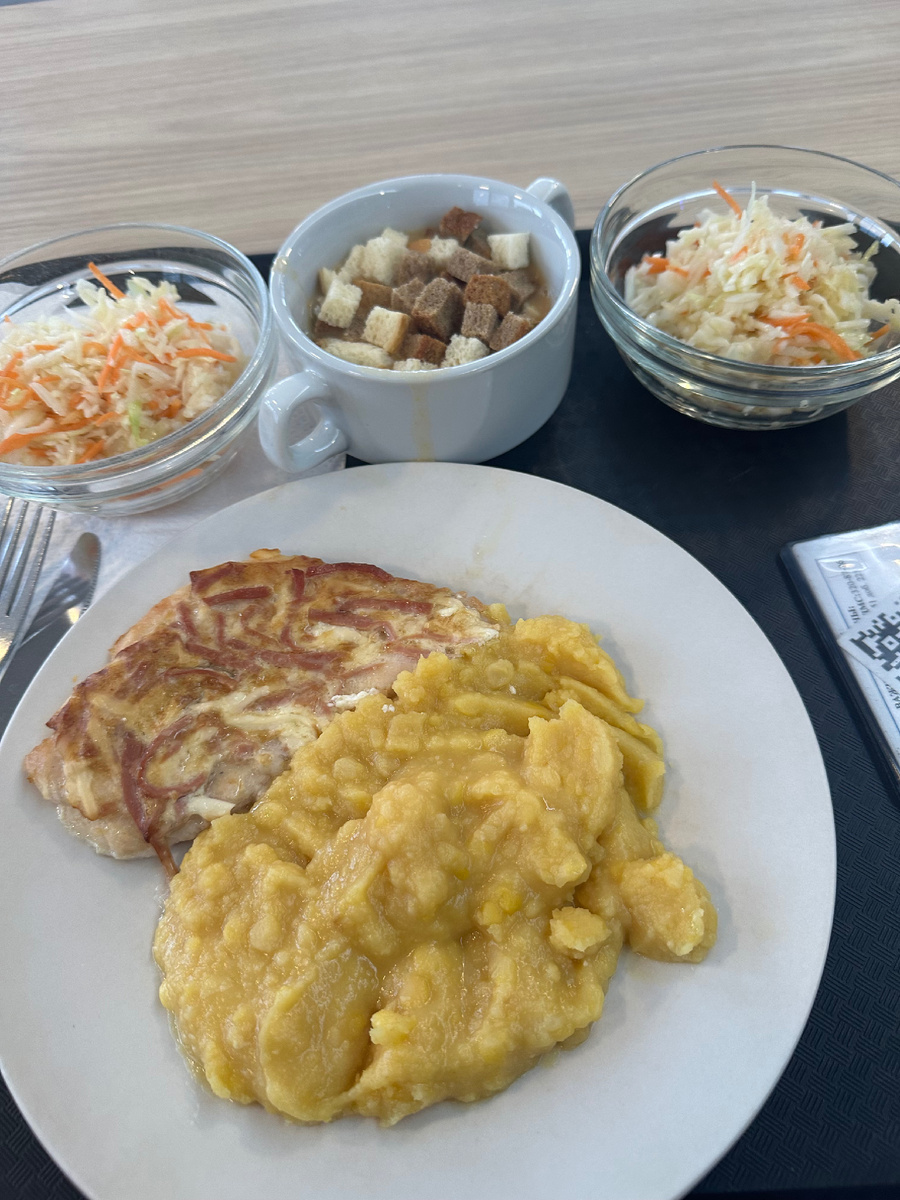 Уехала на работу без завтрака. Был сразу обед. Суп пюре морковный с сухариками, гороховая каша, филе куриное под сыром и ветчиной и два капустных салата.