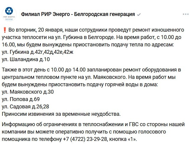 В Белгороде из-за ремонтных работ девять многоквартирных домов останутся без отопления и горячего водоснабжения 20 января
