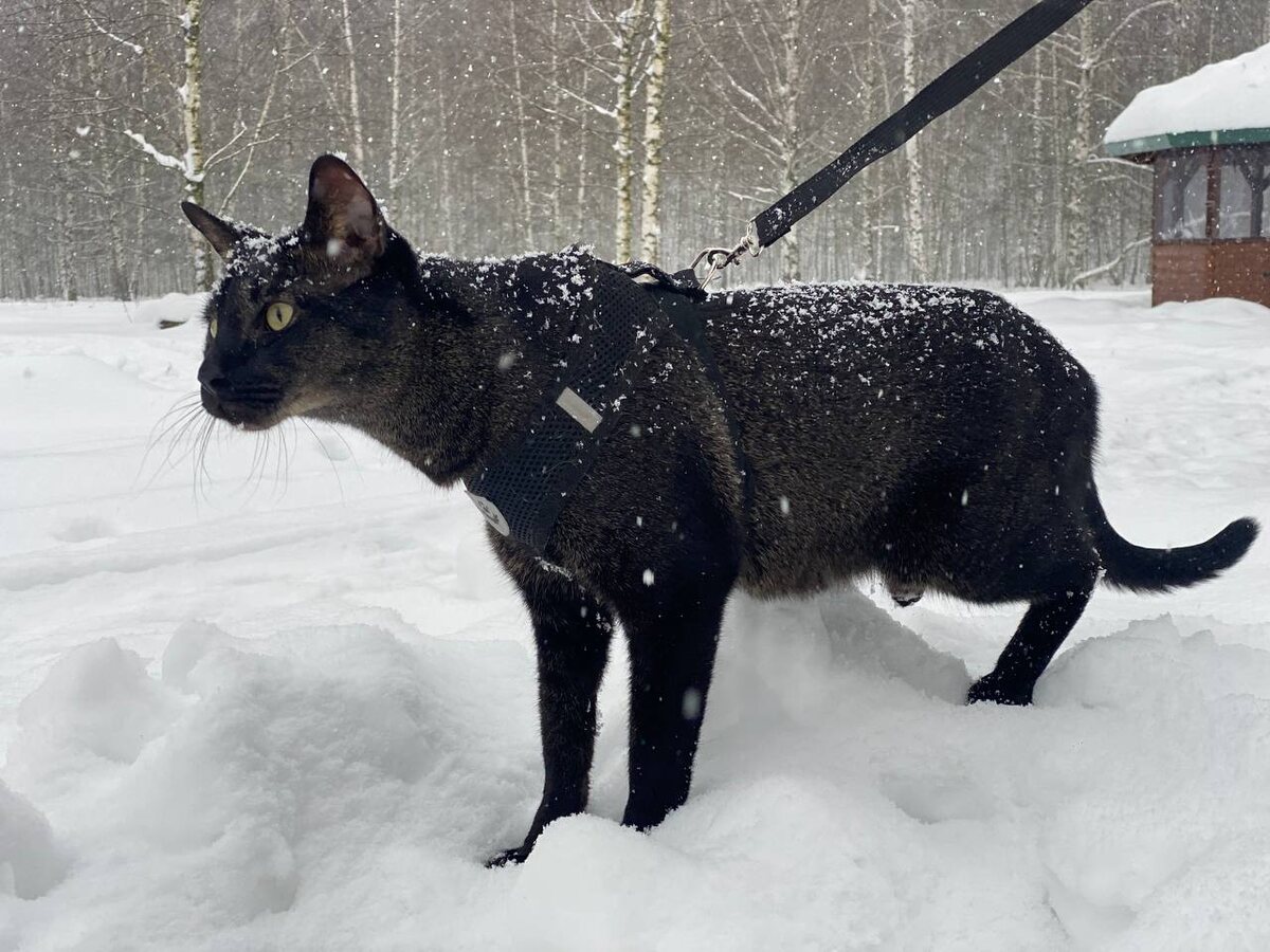 Летом Лимон уже хорошо освоился на улице, и наши прогулки доходили с ним до получаса. В удачные дни кот готов был исследовать мир вне дома и дольше, но либо у меня не хватало на это времени, либо я просто не выдерживала напряжения (я-то все равно продолжала беспрестанно бдить). Осенью я планировала знакомить Лимона с лужами, грязью и прочими погодными изменениями, характерными для этого сезона, но история с Равом, Тирой и некоторые другие жизненные аспекты помешали этому. И, кажется, мы с котом так ни разу и не вышли на улицу. И вот пришла зима (природная, не календарная). С конца декабря мы прокладывали дороги в снегу, потом катали на собаках… И вот только недавно наступило время, когда можно хоть чуть-чуть выдохнуть и заняться чем-то еще, кроме необходимого для выживания в лесу. Поэтому я «снарядила» Лимона в шлейку, и мы отправились на улицу. Только я открыла дверь, перед нами рыжим огоньком промелькнул Персик. Эта неожиданность очень напугала чаузи – настолько, что тот развернулся