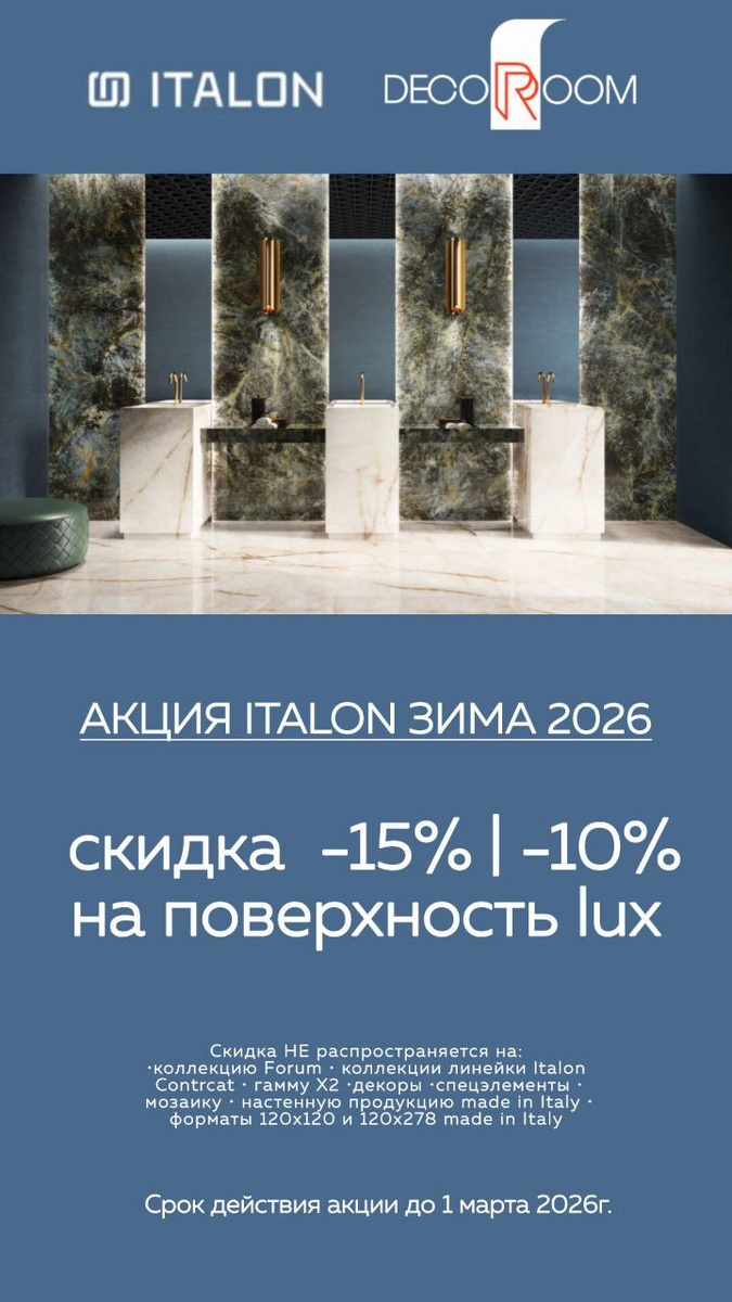 : Всю зиму до 28 февраля 2026 вы можете приобрести фоновый керамогранит ITALON со скидкой -15% и -10% (на поверхность lux). Скидка НЕ распространяется на: 🟡коллекцию Forum 🟡коллекции линейки Italon Contrcat 🟡гамму X2 🟡декоры, спецэлементы, мозаику 🟡настенную продукцию made in Italy 🟡форматы 120х120 и 120х278 made in Italy *срок действия акции до 1 марта 2026г. Уточнить стоимость и ознакомиться со всеми вариантами можно у наших менеджеров москва / новосибирск 📲 #керамогранит #керамогранитdecorrom #decoакции