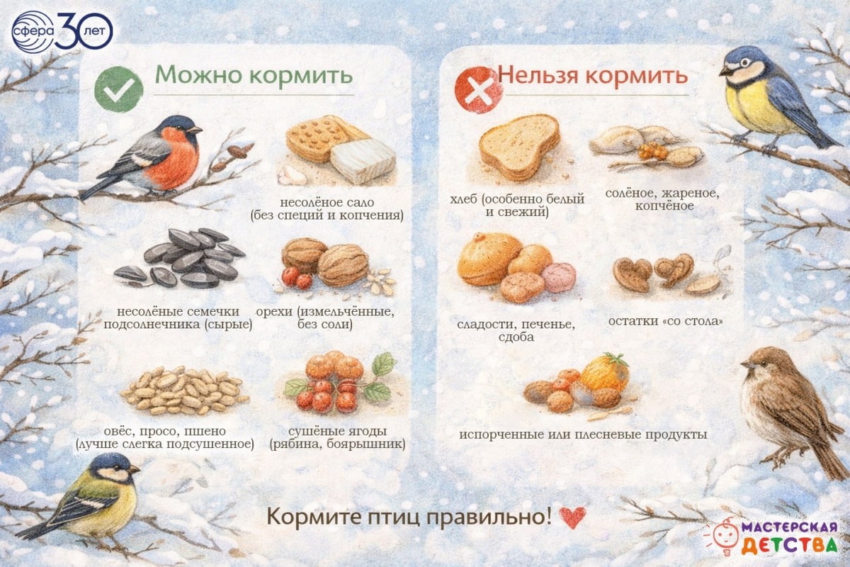 Зимой птицам особенно трудно: еды меньше, сил тратится больше. И наша помощь правда важна, но только если она правильная. Иногда из лучших побуждений мы даём то, что может навредить. На карточке мы собрали короткую и понятную памятку: чем можно и чем нельзя кормить птиц зимой. ❗️ Почему это важно: Неподходящая еда не просто бесполезна - она может нарушить пищеварение и ослабить птицу. А зимой это особенно опасно. ❤️ Отличная идея для семьи: Сделать кормушку вместе с ребёнком, обсудить, какие птицы прилетают, и регулярно подсыпать правильный корм. Это простой способ развивать заботу, наблюдательность и ответственность. В издательстве «Творческий Центр СФЕРА» как раз готовится книга-энциклопедия «Птицы. Познавательная книга для детей 4—8 лет» с понятными объяснениями, иллюстрациями и фактами, которые помогают детям видеть природу внимательнее. А мы в «Мастерской детства» в рамках этого события делимся полезными материалами, которые позже можно будет найти и на страницах книги. Если