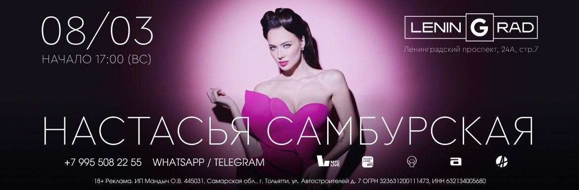 Настасья Самбурская — певица, актриса и телеведущая, лауреат премии «Шансон года». Артистка всегда выступает вживую с музыкальным бэндом, её репертуар состоит не только из классики шансона, таких песен, как «Фраер», «Мурка», «Алёша-Ша», но и чувственных композиций А. Вертинского, а также современных хитов молодых авторов, Юрия Николаенко (NЮ) и Жени Трофимова. Зрители смогут услышать в исполнении Настасьи песни: «Ой, девочки», «Ах, уедь!», «Безответная», «Сильная» и многие другие. Билеты без наценки: qtickets.ru/event/209683 Поддержка: +7 995 508 22 55 WhatsApp / Telegram