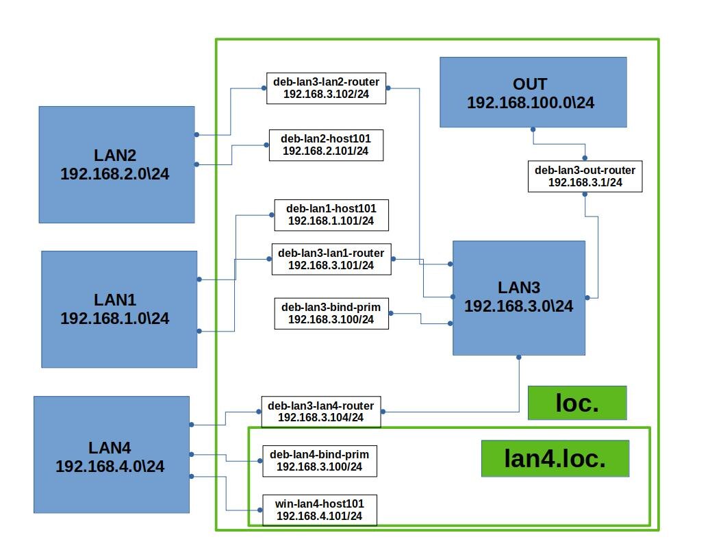 Предполагается, что сервер deb-lan3-bind-prim будет обслуживать зону "loc.", которая содержит все хосты в сегментах LAN1, LAN2, LAN3. И этот же сервер будет делегировать управление зоной "lan4", которая будет содержать хосты в сегменте LAN4. И зону "lan4" будет обслуживать сервер deb-lan4-bind-prim. Т.е. deb-lan3-bind-prim будет делегирующим, а сервер deb-lan4-bind-prim будет делегируемым. Получается какая-то такая схема