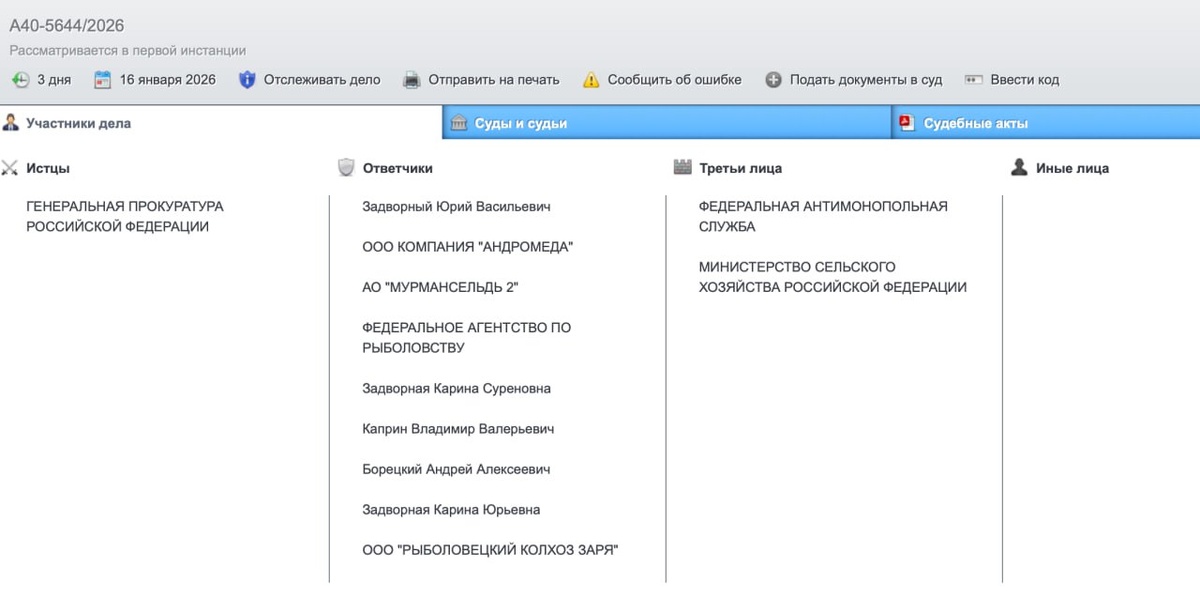 Согласно картотеке дел Арбитражного суда Москвы, речь идёт о компании «Андромеда», «Мурмансельдь-2» и рыболовецком колхозе «Заря». Кроме рыбаков в иске фигурируют Росрыболовство, Юрий Задворный, Карина Юрьевна Задворная, Карина Суреновна Задворная, Владимир Каприн, Андрей Борецкий, а в качестве третьих лиц указаны Федеральная антимонопольная служба и Минсельхоз. Подробности иска неизвестны. Как следует из данных сервиса проверки контрагентов «Rusprofile», все указанные в иске физические лица и компании так или иначе взаимосвязаны. Ранее федеральная антимонопольная служба уже находила нарушения в управлении компаниями, указав на наличие иностранного капитала и требовала лишения квот. ❄ «Арктический Обозреватель»