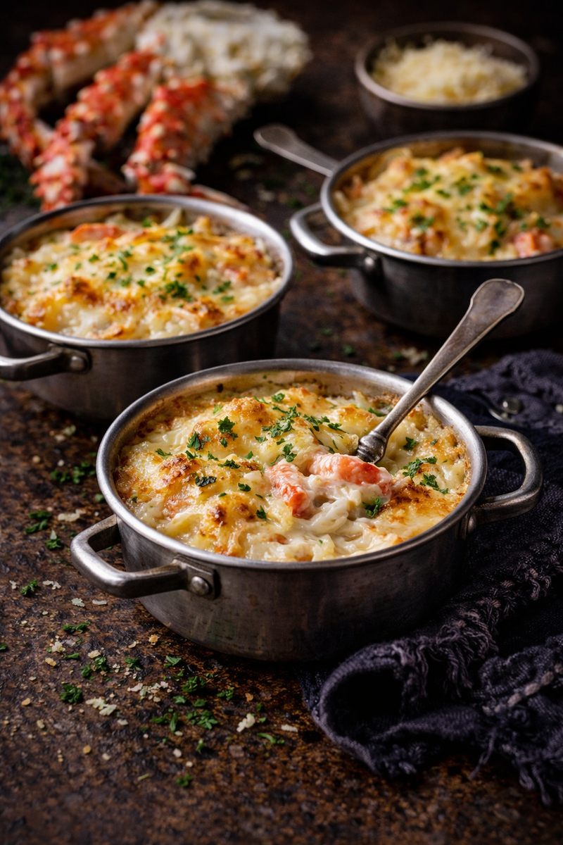 200 г фаланг обжарьте с луком на сливочном масле, добавьте 2 ст.л. сметаны и немного сливок, разложите по кокотницам, посыпьте тёртым грюйером. Запеките 10 минут до румяной корочки. Горячий, тягучий, хрустящий. 3. Ризотто с камчатским крабом