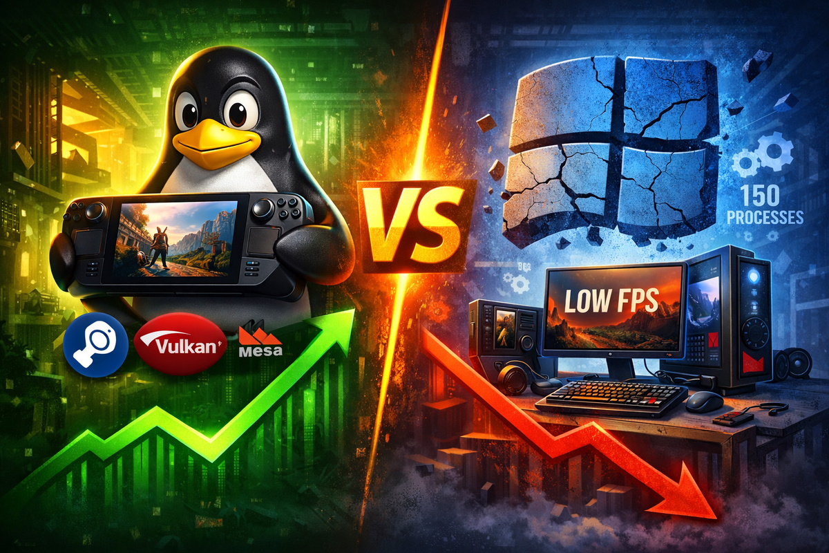 Ещё несколько лет назад сама мысль о том, что в играх Linux может быть быстрее Windows, казалась шуткой. Геймерский мир жил по непреложному правилу: «Хочешь играть — ставь Windows». Сегодня ситуация резко изменилась. Тесты, особенно на портативных устройствах вроде Steam Deck, показывают, что многие проекты работают на Linux плавнее. Как так вышло? Давайте разбираться. Успех Linux в гейминге — это не озарение одного гения, а результат долгой системной работы. Всё дело в сочетании двух факторов: высокоэффективного «переводчика» и значительно меньшей нагрузки самой системы. Главный герой этой истории — Proton. Это технология от компании Valve, создателей Steam. Proton — не эмулятор, а сложный слой совместимости, который в реальном времени «переводит» команды игры, написанной для Windows, на язык, понятный Linux. Разработка Proton — это стратегические инвестиции Valve, которые окупились с лихвой. Второй союзник — минимализм. Представьте, что операционная система — это сцена, а игра — глав