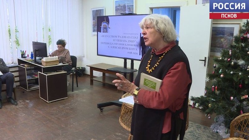 Краевед Тамара Вересова презентовала книгу "Искусством" радовать глаз и утешать душу". Это публикация 20-летней переписки Александра Бенуа и Евгения Климова - до, во время и после второй мировой. И если Бенуа - одна из главных фигур серебряного века, то Климов - лишь один из художников-пейзажистов. Однако именно мозаика Евгения Климова украшает подход к Троицкому собору в Пскове. Работу над иконой творец начал в 1942 году, готова Троица была как раз к освобождению города, но свое нынешнее место заняла только в 2003 году. "Они любили Россию и посвятили всю свою жизнь и творчество нашей стране. А конкретно здесь: Евгений Евгеньевич Климов Псковской земле, в которую он влюбился с первого посещения в 1928 году", - Тамара Вересова, председатель Псковского регионального отделения союза краеведов России.