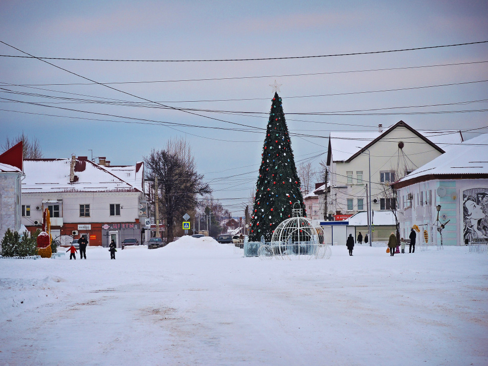 Продолжаю зимнюю прогулку по Кинелю, небольшому городу в Самарской области. Побывал здесь в начале января 2026 года. В первой части мы осмотрели украшенную к новогодним праздникам площадь Мира, центральную площадь южной части города. В новой подборке предлагаю ещё несколько общих видов украшений и небольшую экскурсию по самой площади. Достопримечательности, которые можно увидеть на площади независимо от сезона. Частично показал их рамках летней прогулки, более подробно можно рассмотреть по ссылке в конце статьи. Жилые дома, выходящие на площадь, в 2018-19 годах в рамках общей её реконструкции были украшены тематическими литературными муралами. На одном изображены персонажи романа «Мастер и Маргарита», на другом - «12 стульев». Рядом с ними установлены арт-объекты в виде фонарей. Напротив них находятся здание, в котором размещаются районное отделение ЗАГС и выставочный центр, и городской дом культуры. Между этими зданиями в 2019 году был разбит сквер. Стену ДК, выходящую к нему, украсил