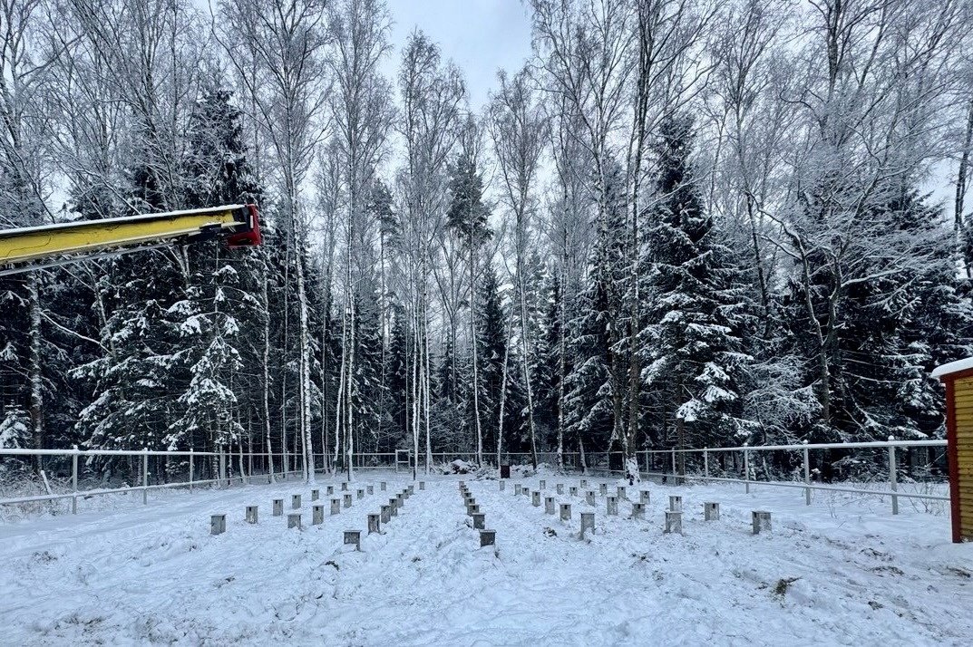 Специалисты КЗС активно начали работу в новом году, и у нас уже есть реализованные проекты, которые можно показать. Например, для заказчика из городского округа Ступино Московской области забили 51 бетонную сваю под дом из бруса площадью 80 кв. м. Результат — на фото. А ниже покажем проект дома и план свайного поля, и затем посчитаем стоимость такого фундамента, актуальную на момент написания материала, 16 января 2026 года. Этот фундамент размером 13,3 × 10,4 м специалисты возвели за один день. Сваи доставили на манипуляторе и забили при помощи копра — мини сваебойной установки. Затем на них установили металлические оголовки. Строители через прослойку гидроизоляции уложат на них брус обвязки. При зимнем монтаже нагрузить бетонные сваи, то есть начать строительство, нужно до оттепели. Бетонные сваи рассчитаны на работу под нагрузкой и не должны оставаться без нее в переходном периоде, когда грунт гуляет. Но стоит дать бетонным сваям проектную нагрузку, они будут надежно служить 80—100 и