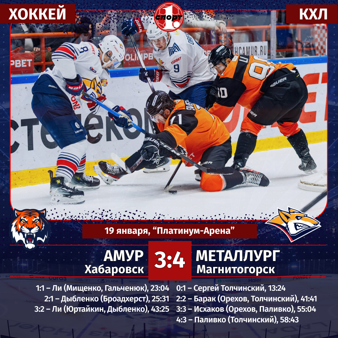 Лидер чемпионата КХЛ магнитогорский «Металлург» одержал непростую победу в чемпионате КХЛ, вырвав ее в концовке гостевого поединка с хабаровским «Амуром» — 4:3. Победу южноуральцам принес точный бросок Данилы Паливко за полторы минуты до финальной сирены. «Металлург» набирает очки уже в 15 играх подряд, продлил он и победную серию до восьми поединков, сообщает корреспондент ИА «Первое областное». «Металлург» и «Амур» находятся на разных полюсах турнирной таблицы. Магнитогорцы уверенно лидируют во всей Лиге, «Амур» цепляется за кубковую восьмерку на «Востоке». Казалось бы, последним очки нужнее, но как из взять, если тебе противостоит объективно лучшая на текущий момент команда чемпионата?! Но «тигры» доказали: если очень захотеть, можно не только покусать сильного оппонента, но и серьезно потрепать ему нервы. Впрочем, первый период завершился в пользу «Металлурга». Это Сергей Толчинский в падении с ползоны нанес неотразимый бросок в паутину ворот дальневосточников — 1:0. Форвард магнит