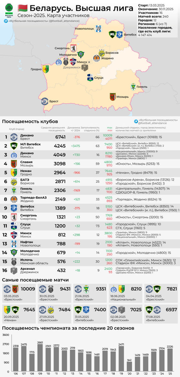 завершившемся сезоне зафиксировано устойчивое восстановление интереса болельщиков к матчам, хотя общая посещаемость остаётся ниже докризисных показателей. Лидером по средней посещаемости остаётся брестское «Динамо», которое собирает в среднем 6741 зр./матч. При этом по заполняемости стадиона «Брестский» (66%) «Динамо» второе в лиге. Рекордный матч сезона прошёл именно здесь — 3 мая 2025 года, когда на игру против «Славии» Мозырь пришло 10 009 зрителей. Это не только самый посещаемый матч сезона, но и один из самых массовых за последнее десятилетие. На втором месте по посещаемости находится «МЛ Витебск» — 4245 зр./матч. Сенсационный чемпион лиги, который был в «вышке» только первый сезон логично показал и наибольший рост аудитории +3475 зр./матч. Третье место занимает столичное «Динамо» — 4049 зрителей, прирост составил 730 человек. Важно отметить, что «бело-голубые» использовали в течение сезона аж четыре стадиона, включая новый «Национальный» вместимостью 33 тысячи мест, в результат