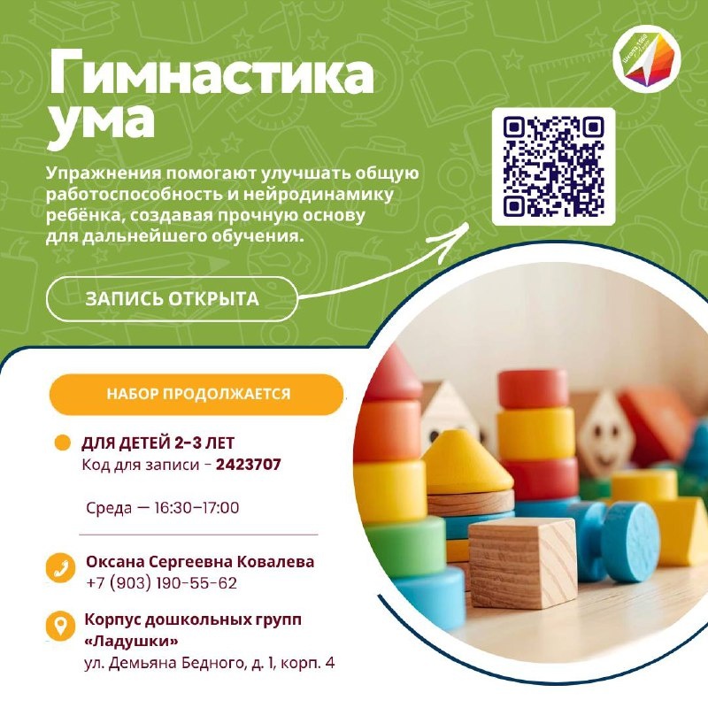 В возрасте 2–3 лет мозг ребёнка развивается особенно активно. Именно в этот период формируются внимание, память, мышление и навыки саморегуляции — функции, которые в дальнейшем определяют способность ребёнка справляться с нагрузками. В школе №1560 «Лидер» 🏫📚🎓 реализуется объединение дополнительного образования «Гимнастика ума» для детей 2–3 лет — программа, направленная на комплексное развитие познавательной сферы и психофизиологических функций ребёнка. Занятия способствуют развитию мышления, внимания и памяти, формированию самоконтроля поведения, развитию крупной и мелкой моторики, пространственных представлений. Упражнения помогают улучшать нейродинамику и общую работоспособность ребёнка, создавая прочную основу для дальнейшего обучения. Место проведения: корпус дошкольных групп «Ладушки» (ул. Демьяна Бедного, д. 1, корп. 4) Расписание занятий: Среда — 16:30–17:00 Код программы на mos.ru: 2423707 Педагог: Оксана Сергеевна Ковалева 📞 +7 (903) 190-55-62 📌 При возникновении
