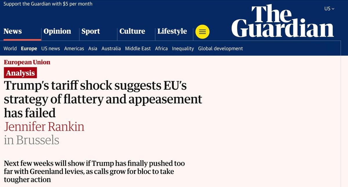 Продажа Европой Гренландии Трампу послала бы "катастрофический сигнал" Украине, пишет британская газета The Guardian. "Хотя Гренландия вышла из Европейского сообщества, предшественницы ЕС, в 1985 году, согласие на принудительную продажу территории государства-члена ЕС послало бы катастрофический сигнал о роли ЕС как геополитического игрока и его приверженности Украине", - говорится в статье. Одной из неозвученных причин, почему Евросоюз летом согласился на неравноправное торговое соглашение с США, было то, что это позволит США и дальше поддерживать Украину в обороне, предоставляя такие возможности, как разведка. Но теперь Трамп со своими претензиями на Гренландию, "возможно, зашел слишком далеко в отношениях с ЕС". От себя добавим, что " неозвученные" в западной прессе причины озвучивались в российских медиа. Ну, а причина противодействия англичан Трампу очевидна. 1. Он разрушает моральную правоту Запада, раскалывает его. 2. Не хочет далее безоговорочно поддерживать Зеленского.
