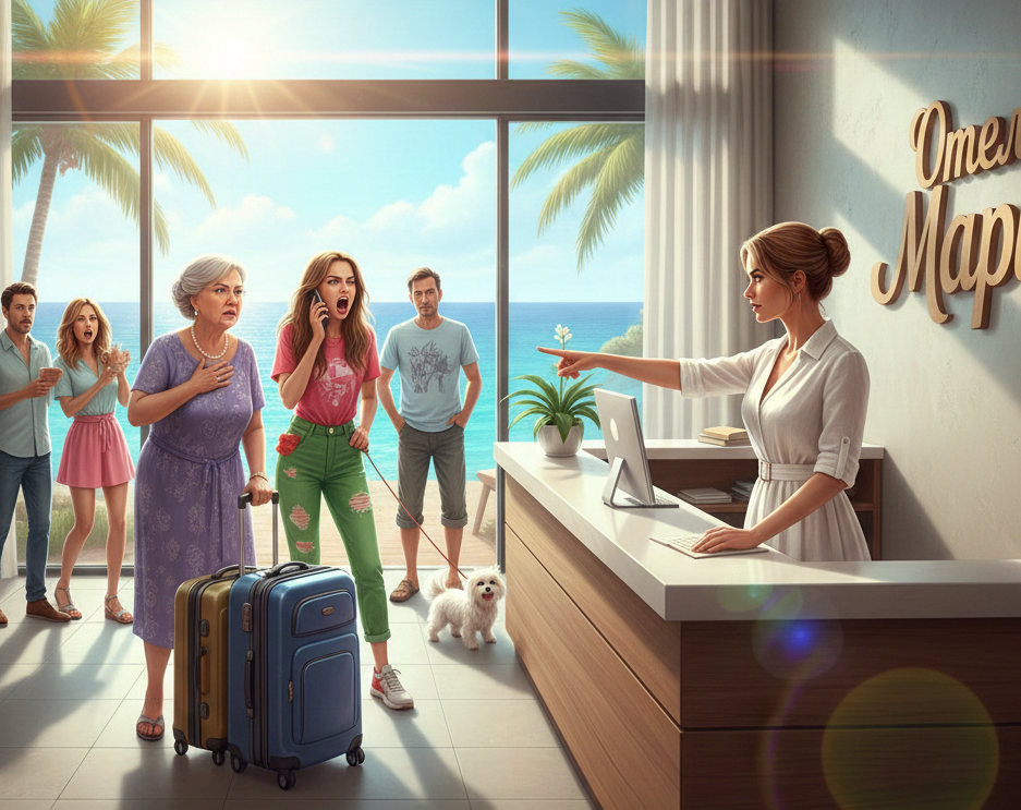 В один из знойных вторников, когда Маша вышла из кухни, она замерла. У стойки регистрации стояла Галина Петровна, Алина с тремя огромными чемоданами и... какой-то незнакомый мужчина с маленькой собачкой.