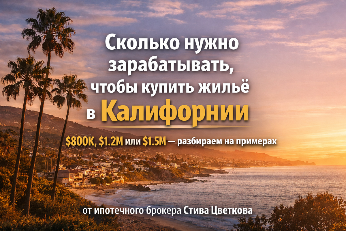 Сколько нужно зарабатывать, чтобы купить жильё в Калифорнии: примеры на $800k / $1.2M / $1.5M (от ипотечного брокера Стива Цветкова). Когда люди спрашивают: «Сколько нужно зарабатывать, чтобы купить дом в Калифорнии?», они обычно ждут одно число. Но банк так не работает. Банк считает платёж, а потом смотрит — влезает ли он в вашу финансовую картину. Поэтому я покажу три типичных сценария покупки — $800k, $1.2M и $1.5M — и объясню, какой доход обычно нужен по правилам банка, если считать “как считают кредиторы”. Сразу скажу важное: цифры ниже — пример для понимания логики. В реальности платёж зависит от ставки на момент заявки, округа, страховки, HOA, вашего кредита, долгов и типа дохода. Но принцип будет один и тот же. Что банк считает “платежом за жильё”