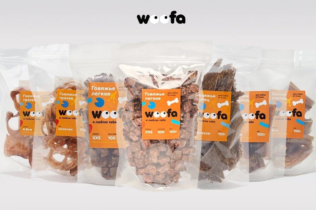В линейке Woofa говяжье лёгкое — хит продаж: лёгкое удобно носить в кармане, кусочки идеальны для дрессировки и так вкусно хрустят. Просто объеденье!