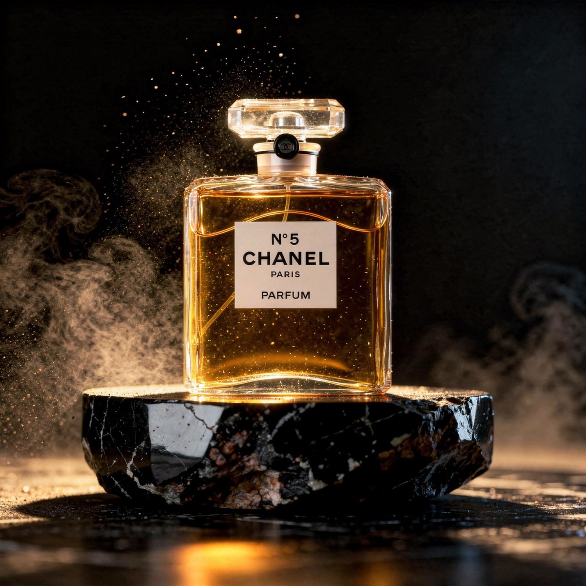 Ultra-realistic cinematic dark luxury perfume advertising photo featuring the exact perfume bottle from the provided reference image, preserving identical bottle geometry, proportions, glass thickness, beveled transparent cap, warm amber liquid color, realistic label placement and reflections, bottle positioned upright on a polished black obsidian stone pedestal, hero object occupying 60–65% of the frame, elegant museum-style composition with strong silhouette separation and premium negative space, environment: deep black and dark amber studio atmosphere with subtle volumetric haze and floating micro dust particles, luxury gallery night mood, refined minimalism without clutter or overlapping props, lighting setup: dramatic warm golden key light sculpting glass edges, liquid depth and stone texture, controlled sculptural shadows creating dimensional volume, subtle cool rim light outlining bottle contour and cap facets, realistic internal caustics inside glass and liquid, specular highli