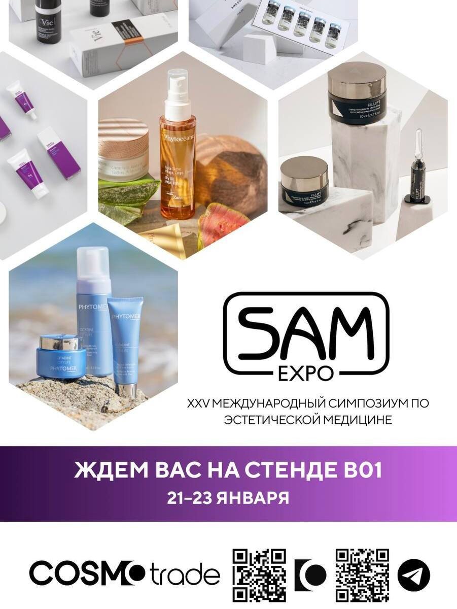 — XXV Международном симпозиуме по эстетической медицине! 😍 📍Москва, Центр Международной Торговли (ЦМТ) ‼️Наш стенд: B01 Будем рады личному знакомству, живому общению и профессиональному обмену опытом. Приходите обсудить актуальные решения, познакомиться с новинками и задать свои вопросы🤍 Ждем вас все три дня — с 21 по 23 января — на стенде B01 в ЦМТ До встречи на SAM EXPO ⭐️ ➡️ Регистрация