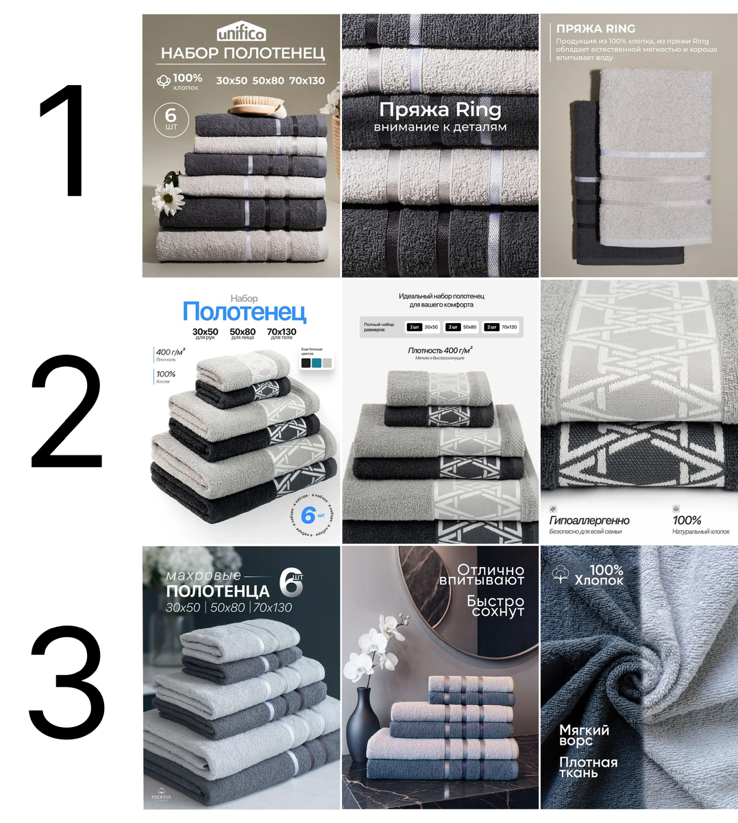 Соскучилась уже по разборам) С прошлого года еще просили разобрать полотенца - всё помню. Тем более, что это очень даже подарочный товар, посмотрим, у кого лучше это получилось. Взяла в этот раз очень бюджетные наборы. За 6 полотенец (2 банных, 2 средних, 2 для рук) - всего 1100-1200 рублей. Все производство Узбекистан. Немного различаются по плотности - вот и посмотрим, сумели воспользоваться преимуществом/скрыть недостаток или нет. Смотрим на Озон. Цифры конверсий очень говорящие у этого примера. На всякий случай посмотрела, чтобы среднее время доставки было примерно одинаково - перед НГ это важно. Продажи - 2,7 млн, 533 тыс, 132 тыс рублей. Доп.слайды - в комментариях. Какая карточка продает больше? Пока вы размышляете, можно посмотреть опрос в моем ТГ канале Готовы. Теперь разберем... Больше продает карточка 3, 2 - на 2 месте. Причем вы не просто так в голосовании ставили на 1 - у нее лучший CTR. CTR: 1 - 5,8%, 2 - 4,8%, 3 - 4,7%. Но у 3 делаем скидку на большое количество показов