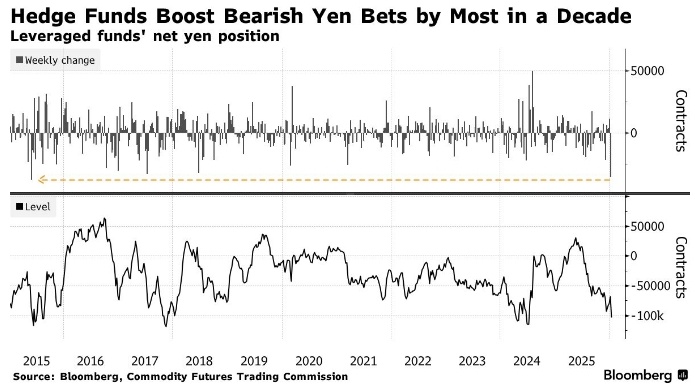 Трейдеры ожидали победы премьер-министра Санаэ Такаичи на выборах и последующих мер по стимулированию экономики, что могло привести к увеличению бюджетного дефицита. На прошлой неделе хедж-фонды значительно увеличили ставки на падение курса иены, достигнув рекордного уровня более чем за десять лет. Это произошло на фоне ожиданий досрочных выборов в Японии, которые могли повлиять на фискальную политику страны. Согласно отчёту Комиссии по торговле товарными фьючерсами, за период с 4 по 13 января чистые короткие позиции по иене выросли на 35 624 контракта. Это стало максимальным показателем с мая 2015 года и первым увеличением медвежьих ставок за последние пять недель. Японская валюта упала до самого низкого значения с июля 2024 года. Трейдеры ожидали победы премьер-министра Санаэ Такаичи на выборах и последующих мер по стимулированию экономики, что могло привести к увеличению бюджетного дефицита. Снижение курса иены вызвало предположения о возможном вмешательстве со стороны властей для с