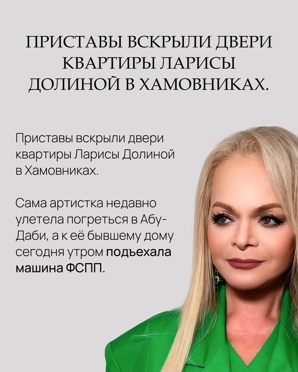 Приставы вскрыли двери квартиры Ларисы Долиной в Хамовниках. Сама артистка недавно улетела погреться в Абу-Даби, а к её бывшему дому сегодня утром подъехала машина ФСПП. Сотрудники вскрыли жильё и составили опись имущества, чтобы не было претензий, адвокат Полины Лурье получила ключи. Теперь новая владелица официально сможет заехать в квартиру. Стороны пытались договориться миром: покупательница хотела заселиться ещё в новогодние каникулы. Чувство злорадства по отношению к Ларисе Долиной не испытываю , испытываю удивление, что ее пиарщики, если они есть, не подсказывают ей правильную линию поведения.