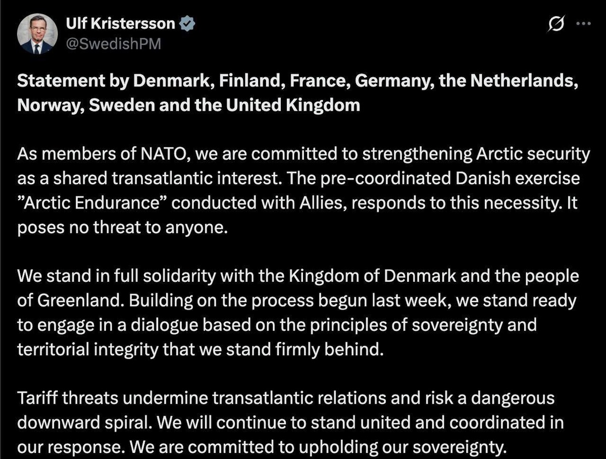 Заявление также подписала Финляндия, Франция, Германия, Нидерланды, Норвегия, Швециия и Великобритания. «Мы выражаем полную солидарность с Королевством Дания и народом Гренландии. Опираясь на процесс, начатый на прошлой неделе, мы готовы к диалогу, основанному на принципах суверенитета и территориальной целостности, которые мы твердо поддерживаем», - говорится в заявлении. Подписанты говорят, что проводят в Гренландии «скоординированные учения», которые «не представляют угрозы никому». Также в заявлении критикуются пошлины, которые Трамп ввёл против стран, которые прислали войска в Гренландию. «Тарифные угрозы подрывают трансатлантические отношения и грозят опасной нисходящей спиралью. Мы будем и впредь действовать единодушно и скоординированно. Мы привержены защите нашего суверенитета», — заявили Дания и ее союзники. Отметим, что немецкие солдаты, которые высадились в Гренландии, уже ушли оттуда. Первые «ветераны» Первой Гренландской.))😅 🌐 За Русский Мир©Резервный📣Наш Чат✔