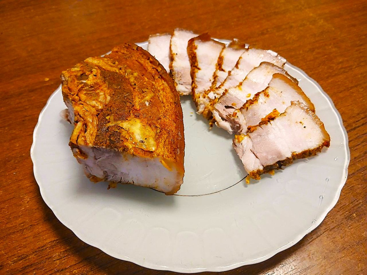 Когда я впервые попробовала эту домашнюю грудинку, я поняла — простые способы часто дают самый тёплый и искренний вкус. Сочная, с тонкой корочкой ароматных специй и лёгким букетом лавра и перца, она напоминает те семейные обеды, где каждый кусочек — история. Готовлю её тогда, когда хочу устроить спокойный вкусный ужин или взять с собой на пикник: тонко нарезанная грудинка отлично идёт к чёрному хлебу, свежим огурцам и домашнему горчичному соусу. Ингредиенты: ⦁ свиная грудинка — 700–800 г ⦁ соль — 4 ст. л. ⦁ чёрный перец горошком — 15 шт. ⦁ душистый перец горошком — 10 шт. ⦁ лавровый лист — 3–5 шт. ⦁ жмень луковой шелухи ⦁ 3–4 зубчика чеснока ⦁ молотый чёрный перец — 1 ч. л. ⦁ специи для смазывания по вкусу (я брала красную паприку и сухой чеснок) Подготовка и варка: 1. В большой кастрюле довожу до кипения достаточное количество воды, чтобы полностью покрыть грудинку. 2. Кладу в воду соль, чёрный и душистый перец горошком, лавровый лист и луковую шелуху — она придаст тёмный, тёплый отте