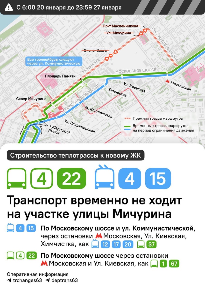 С шести утра 20 января и до конца дня 27 января будет перекрыт перекресток Мичурина с улицей Челюскинцев. Ограничения затронут не только личный транспорт, но и общественный. Для минимизации неудобств пассажиров уже разработаны специальные объездные маршруты: https://oboz.info/uchastok-ulitsy-michurina-v-samare-zakroyut-dlya-transporta-na-nedelyu/