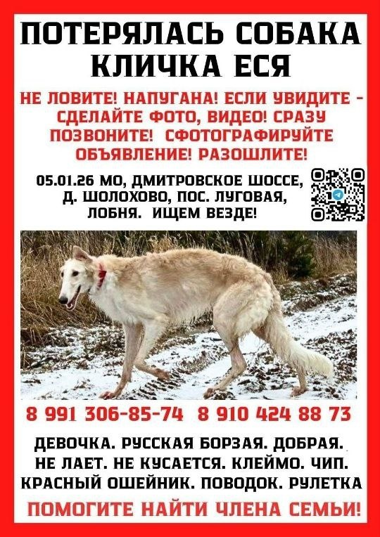 ! 📍 МО, го Мытищи, село Марфино (Дмитровское шоссе) 05.01.2026 🚨10.01.2026, 13:30 📍МО, Лобня, СНТ "Лесная полянка" Пропала русская псовая борзая! Белая с кремовым оттенком по спине и бокам. Красный ошейник, рулетка. 🙏 Нужна помощь в расклейке объявлений и поиске по местности, распространении информации по местным чатам. 👤️ 89913068574 👤89104248873 Чат поиска: 🔎t.me/+jvtZF_DxP... Сейчас может быть где угодно! Активно перемещается. Если заметили или придержали, позвоните, пожалуйста!