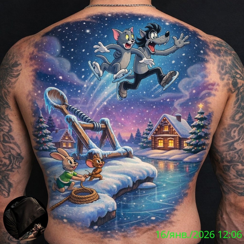 Татуировки, вдохновлённые мультфильмами, всегда привлекали внимание своей уникальностью и ностальгической атмосферой. На представленном фото изображена татуировка, выполненная в стиле «Ну, погоди!» и «Том и Джерри!» — культовых советского мультфильма, которые стал символом