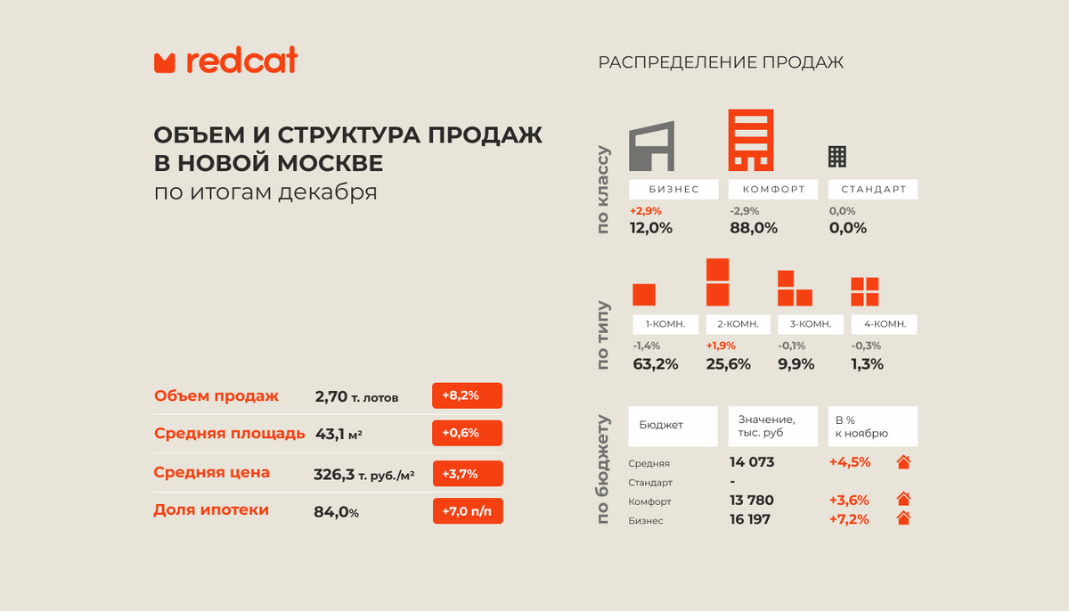 В Новой Москве в декабре спрос продолжил расти, причем динамика роста сохранилась на уровне предыдущего месяца, в результате в декабрь стал самым результативным месяцем 2025 года по количеству зарегистрированных ДДУ. По итогам месяца в Новой Москве было продано 2,70 тыс. квартир и апартаментов, что на 8,2% больше, чем в ноябре, если сравнивать текущие показатели с прошлым годом, то декабрь этого показал результаты на 20% слабее. В течение месяца практически все увеличение спроса было сконцентрировано в сегменте дорогого жилья, количество сделок с квартирами комфорт-класса за месяц выросло на 5,0%, а с квартирами класса бизнес – на 43,2%. Так 88,0% (-2,9 п/п) всех сделок в Новой Москве приходится на новостройки комфорт-класса, доля бизнес-сегмента, выросла на 2,9 п/п до 12,0%. Что касается структуры по количеству комнат, то здесь, самый значительный прирост показали двухкомнатные лоты, количество сделок с ними выросло на 16,7%, тогда как спрос на однушки и трешки подрос на 6-7%. По итог