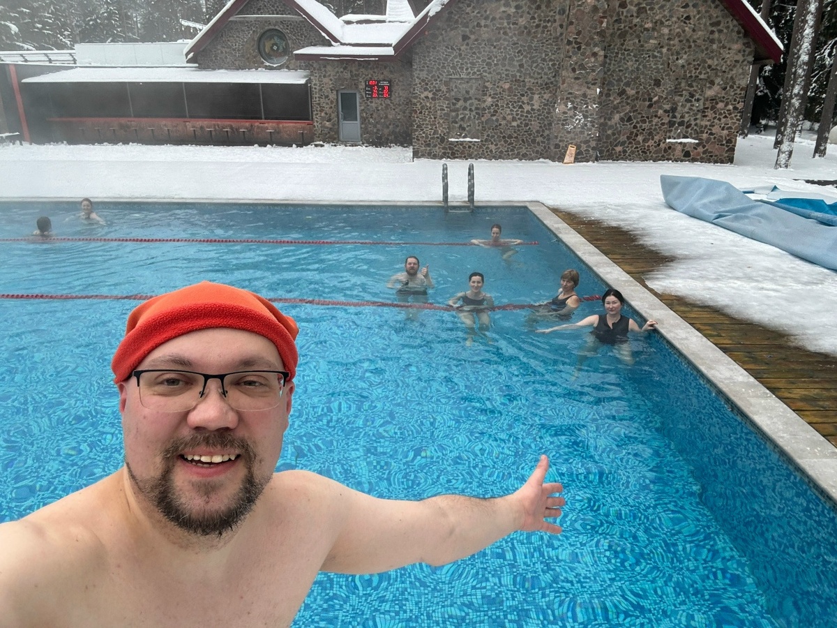Наша традиция, зимних купаний в теплом бассейне! Прогулялись по двум не официальным экотропам: Мухинское болото и ручей Суооя. Приятно, что местные сами обустраивают места. А еще мы увидели другую Линдуловку, так я называю лес с противоположной стороны железной дороги от знаменитого и очень популярного ООПТ. Места здесь не менее красивые, чем в заказнике, а еще тут меньше толп туристов. Ближе к Рощино появляются лыжники, так что кто искал место для зимних прогулок на лыжах, это прям идеальное! Кто пробовал купаться в бассейне под открытым небом, никогда не променяет на закрытые. Свежий прохладный воздух сверху и теплая вода снизу, - идеальное сочетание. Баня/ Сауна больше как небольшое помещение для согревания и сушки, но 64 градуса сухого воздуха это очень мягкое согревание, не парение. Вечером в бассейне включается подсветка. Мы так накупались за 2 часа, что даже почувствовали ту приятную усталость после активностей, свежего воздуха, купания в открытом бассейне. Релакс поход уда