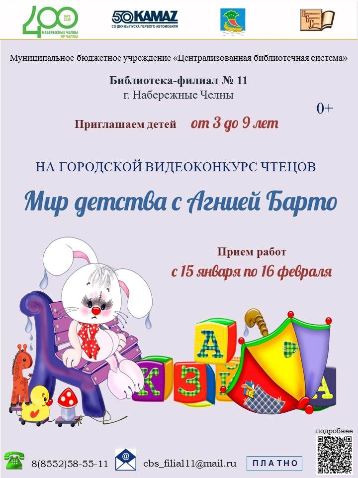 Работы присылать на адрес электронной почты cbs_filial11@mail.ru до 16 февраля включительно. Телефон для справок: 8-(8552)-58-55-11 Положение конкурса https://библиотека-челны.рф/konkursy-i-akcii/gorodskoj-videokonkurs-chteczov-mir-detstva-s-agniej-barto-0
