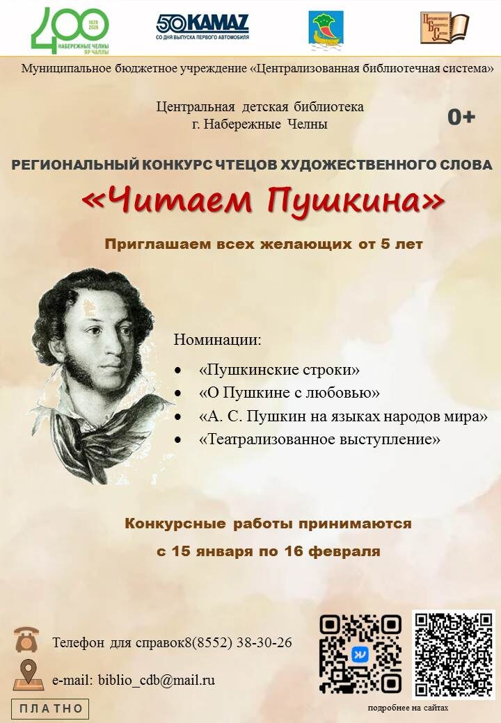 С 19 января по 16 февраля 2026 года МБУ «Централизованная библиотечная система» приглашает всех желающих принять участие в региональном конкурсе чтецов художественного слова «Читаем Пушкина». Конкурс проводится в следующих номинациях: «Пушкинские строки» «О Пушкине с любовью» «А. С. Пушкин на языках народов мира» «Театрализованное выступление» Форма проведения конкурса заочная. Для участия в Конкурсе необходимо подготовить выступление выразительного чтения произведения на русском или на других языках народов мира любой тематики и жанра (проза, поэзия), стихотворения, посвящённые творчеству поэта, видеоролик с инсценировкой произведений А.С. Пушкина. Телефон для справок: 89172374842 Е-mail: biblio_cdb@mail.ru Положение конкурса https://библиотека-челны.рф/konkursy-i-akcii/regionalnyj-konkurs-chteczov-hudozhestvennogo-slova-chitaem-pushkina-0