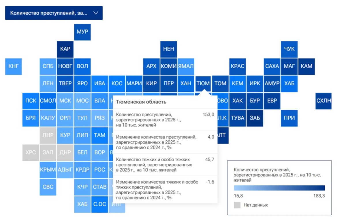 В регионе на 10 тысяч человек приходится 153 зарегистрированных преступлений. По сравнению с 2024 годом их число сократилось на 4%. Годом ранее он занимал 51-е место, говорится в исследовании «РИА Рейтинг». Меньше всего преступлений происходит в Чечне, Ингушетии и Дагестане, а больше всего — в Карелии, Забайкальском крае и на Алтае. ❤️ Подписаться | Предложить новость | Дать «буст» | Мы в МАХ