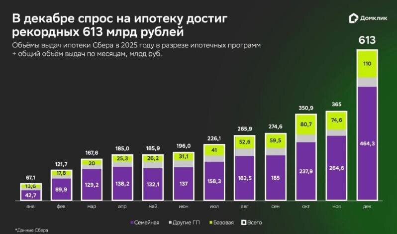🥉 В декабре-2025 Домклик зафиксировал рекордный за пять лет спрос на ипотеку: общий объём выдач достиг 613 млрд рублей, что почти на 70